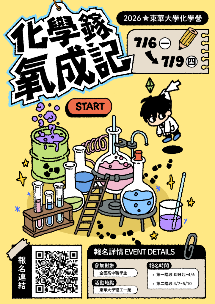 2026東華化學營 – 《化學鎵氧成記》現正熱烈招生中 https://docs.google.com/forms/d/e/1FAIpQLSc7xWyrYMSXS8F8lin9IuhiJto15CTSlqJB6mHMVU4Ls4koBQ/viewform?usp=send_form(報名表單) 國立東華大學 2026 暑期化學營 報名簡章下載 分享至Facebook Share this content Opens in a new window Facebook Read more articles Previous Post東華化學系化學運動會 Next Post115學年度化學系碩士考試錄取名單